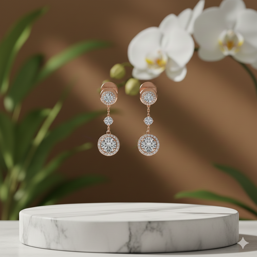 Anting Gantung Berlian Glamor. Desain bertingkat dengan stud dan liontin lingkaran berlian. Menciptakan pantulan cahaya yang mempesona .