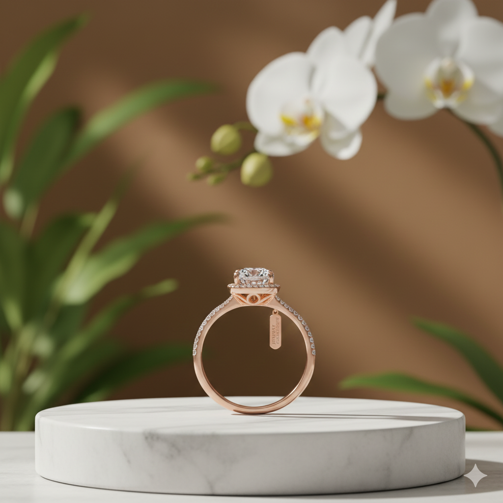 Cincin Berlian Persegi Abadi. Berlian utama persegi dengan halo berlian. Pita rose gold berhias berlian micro-pavé. Simbol cinta dan kemewahan klasik.