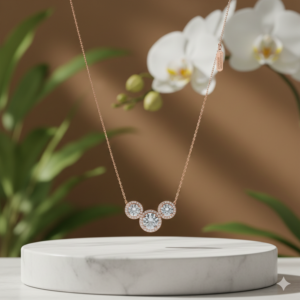 Kalung Tiga Berlian Elegan. Rantai rose gold tipis dengan tiga liontin berlian lingkaran yang dikelilingi berlian kecil. Kemewahan yang berkelas.